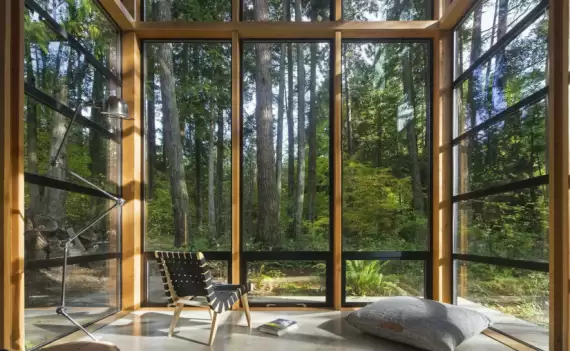 В частном доме возможна установка панорамного остекления с обзором до 180°. Для конструкции можно выбрать 1 из 3 профилей: пластиковый, алюминиевый или деревянный. Если частный дом используется для круглогодичного проживания, окна лучше выбирать тёплые. А вот для панорамного остекления балкона коттеджа подойдёт и холодный вариант.